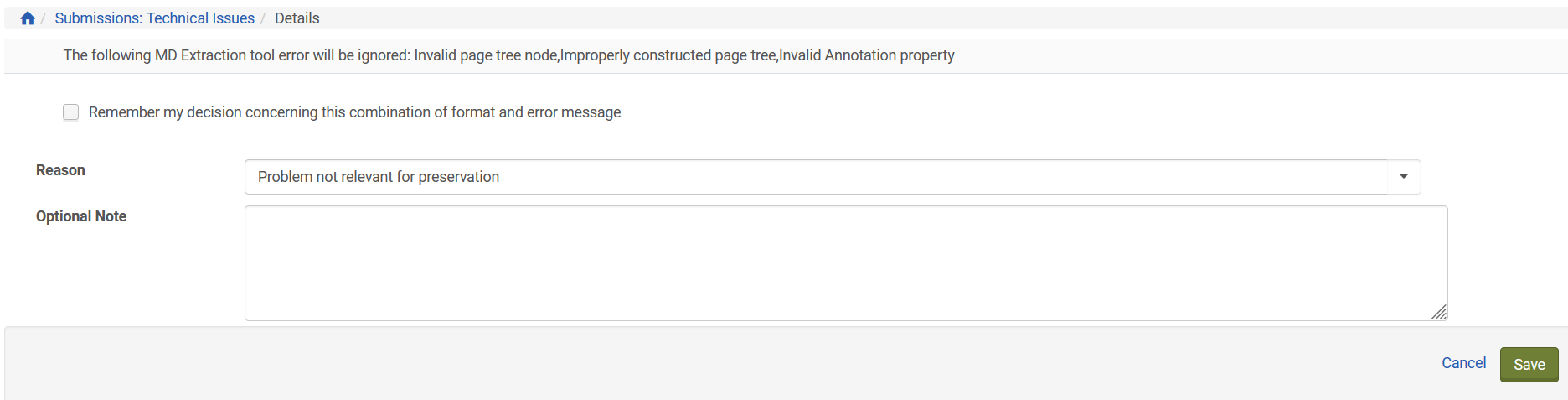 Wenn auftretende Validierungsfehler nicht das Rendering von Dateien beeinträchtigen, können Institutionen diesen Fehler behandeln, indem sie ihn ignorieren und die Dateien in unveränderter Form in den Permanentspeicher von Rosetta verschieben. Sobald eine Möglichkeit zur Fehlerbehebung bekannt ist, können die Fehler auch zu einem späteren Zeitpunkt korrigiert werden, auch wenn sich die Dateien bereits im Permanentspeicher befinden.