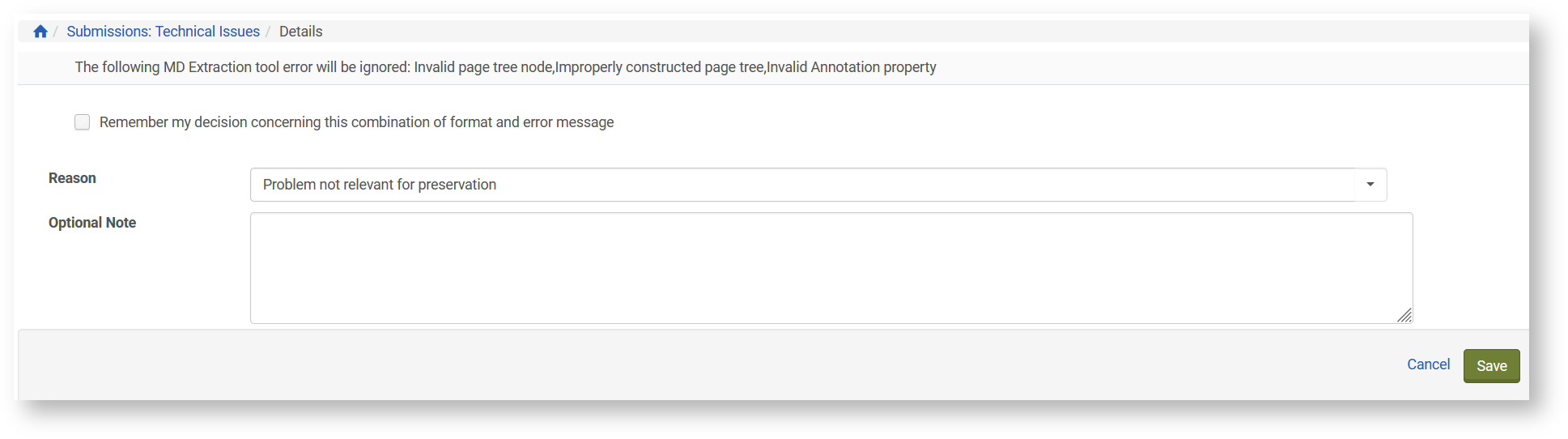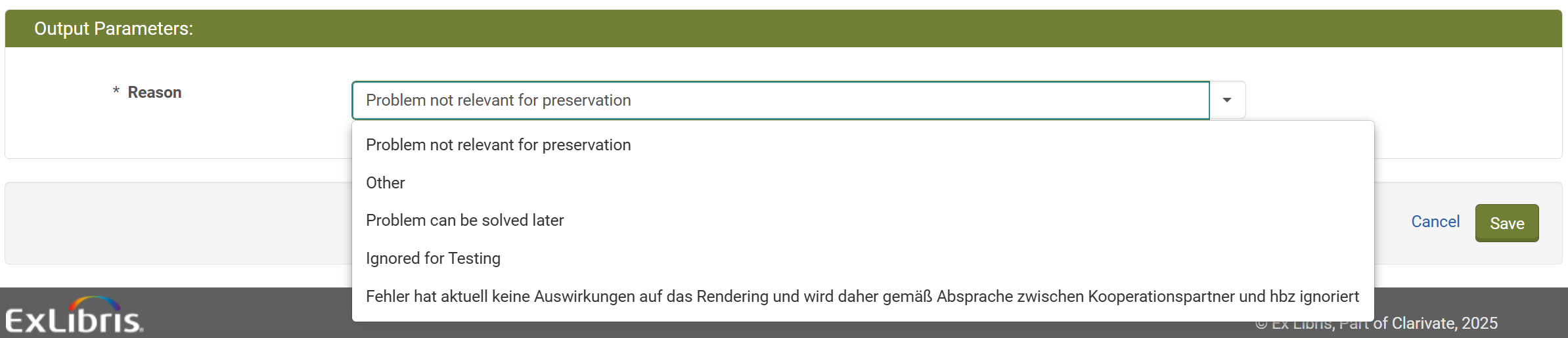 Dort kann der Grund für das Ignorieren des Fehlers und eine optionale Notiz hinzugefügt werden. Bei Validierungsfehlern sollte als Grund "Problem can be solved later" ausgewählt werden, da sich alle Validierungsfehler auch nach dem Verschieben in den Permanentspeicher von Rosetta noch beheben lassen. Die optionale Notiz sollte die Fehlermeldung enthalten sowie einen Reparaturvorschlag, sofern ein solcher bekannt ist. Das hbz hat dafür zwei generische Textbausteine erarbeitet, die individuell an Ihre Institution und die jeweilige Fehlermeldung angepasst werden können (siehe unten).