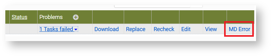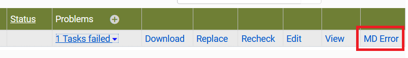 Wenn die Validierungsfehler ignoriert werden sollen, ist es wichtig, dies entsprechend zu dokumentieren, um die spätere Nachvollziehbarkeit zu gewährleisten. Dazu geht man im Technical Analyst auf den Reiter Validierung. Dort können die einzelnen Dateien und die JHOVE-Fehlermeldungen eingesehen werden, nachdem man ein SIP ausgewählt hat. Mit einem Klick auf den Button MD Error öffnet sich ein neues Menü.