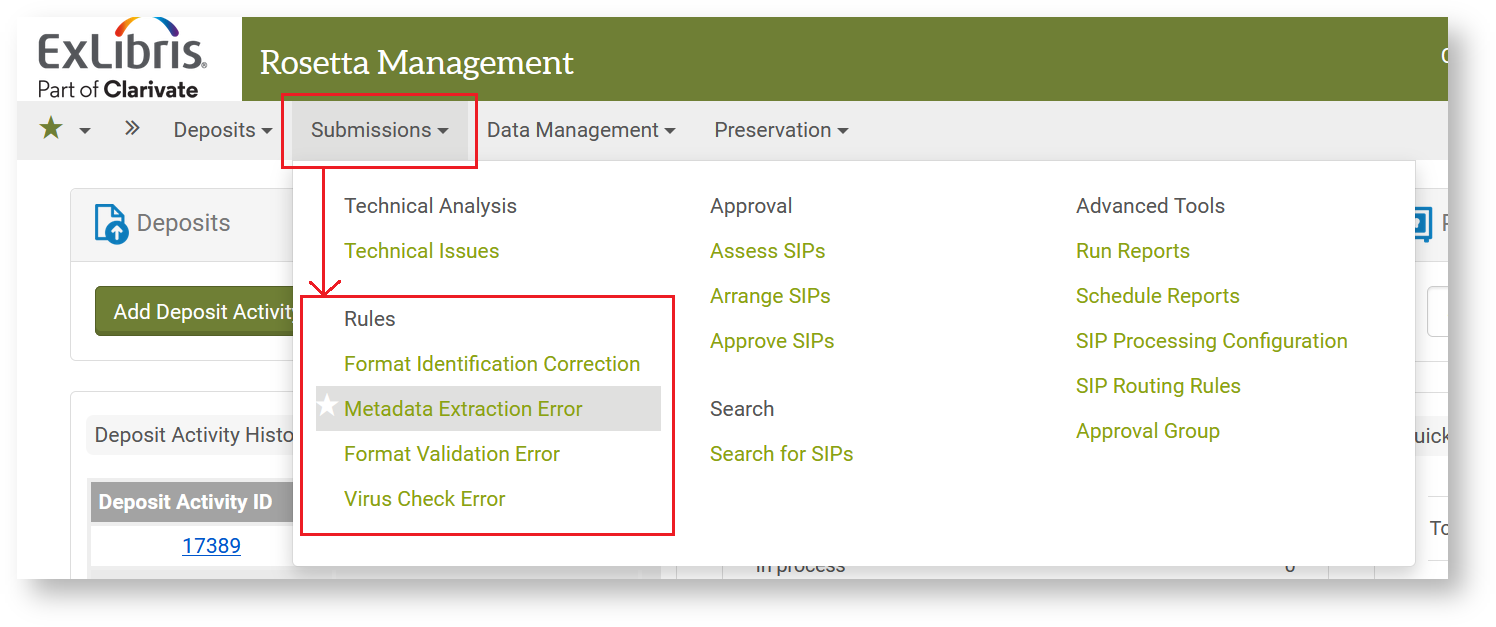 - Format Validation Error ignoriert JHOVE-Fehlermeldungen bei nicht validen Dateien. Meldungen in dieser Kategorie treten nur auf, wenn Metadata Validation und Metadata Extraction mit unterschiedlichen Tasks durchgeführt werden. Fehlermeldungen zu nicht validen Dateien werden durch die Rosetta-Konfiguration des hbz standardmäßig als Metadata Extraction Error angezeigt.