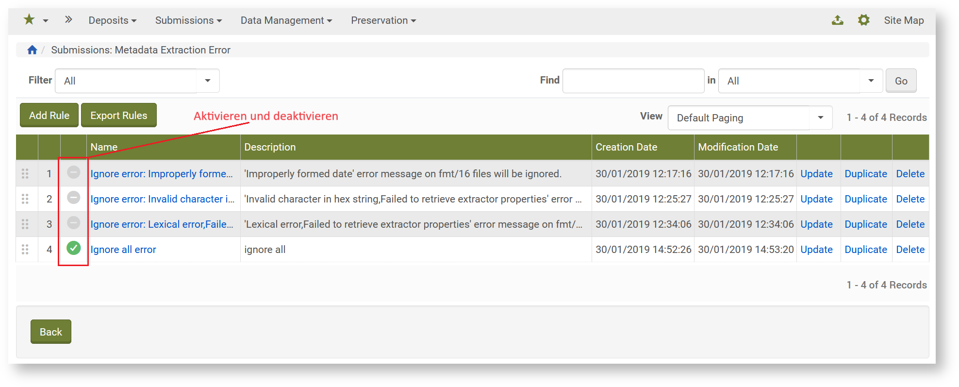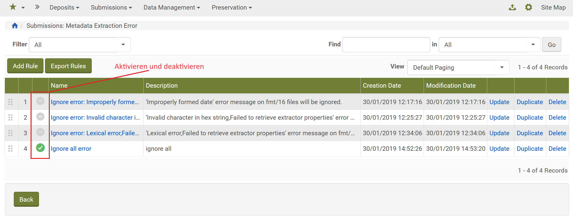 Mit einem Klick auf das Häckchen vorne können Regeln aktiviert und deaktiviert werden. Ist das Häkchen grün, ist die Regel aktiv. Sie wird dann bei einem neuen Ingest oder Rerun automatisch auf alle Dateien angewendet, die den festgelegten Kriterien entsprechen.