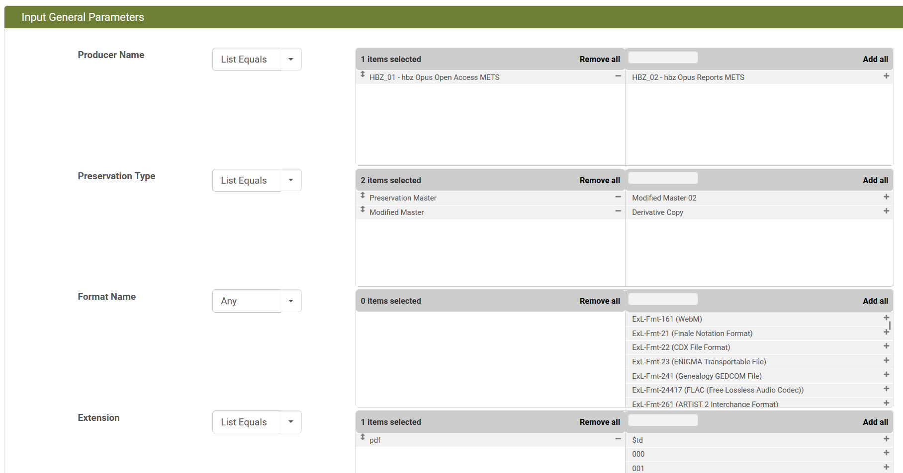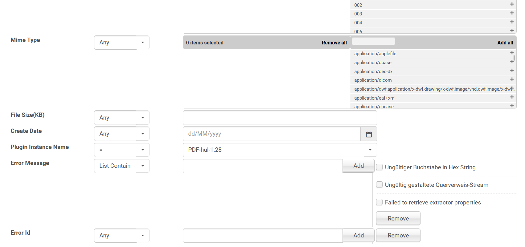 Nachdem eine Regelkategorie ausgewählt worden ist, kann im darauffolgenden Menü eine spezifische Regel mit verschiedenen Parametern erstellt werden. Dazu kann je Kategorie von Parametern, z.B. Producer oder Extension, eine Liste von Items aus allen vorhandenen Möglichkeiten erstellt werden, z.B. mehrere Dateiformate oder der Name eines Producers. Weitere mögliche Parameter sind Dateigröße und Erstellungsdatum. Wichtige Parameter sind die Auswahl des betroffenen Validator-Plugins, z.B. PDF-hul-1.26, und das Einschränken nach bestimmten Fehlermeldungen und Fehler-IDs. Dies ermöglicht es, eine Regel für einen ganz bestimmten Fehler oder eine Gruppe von ähnlichen Fehlern anzulegen.