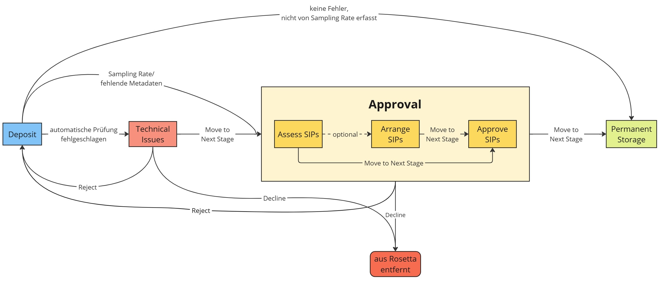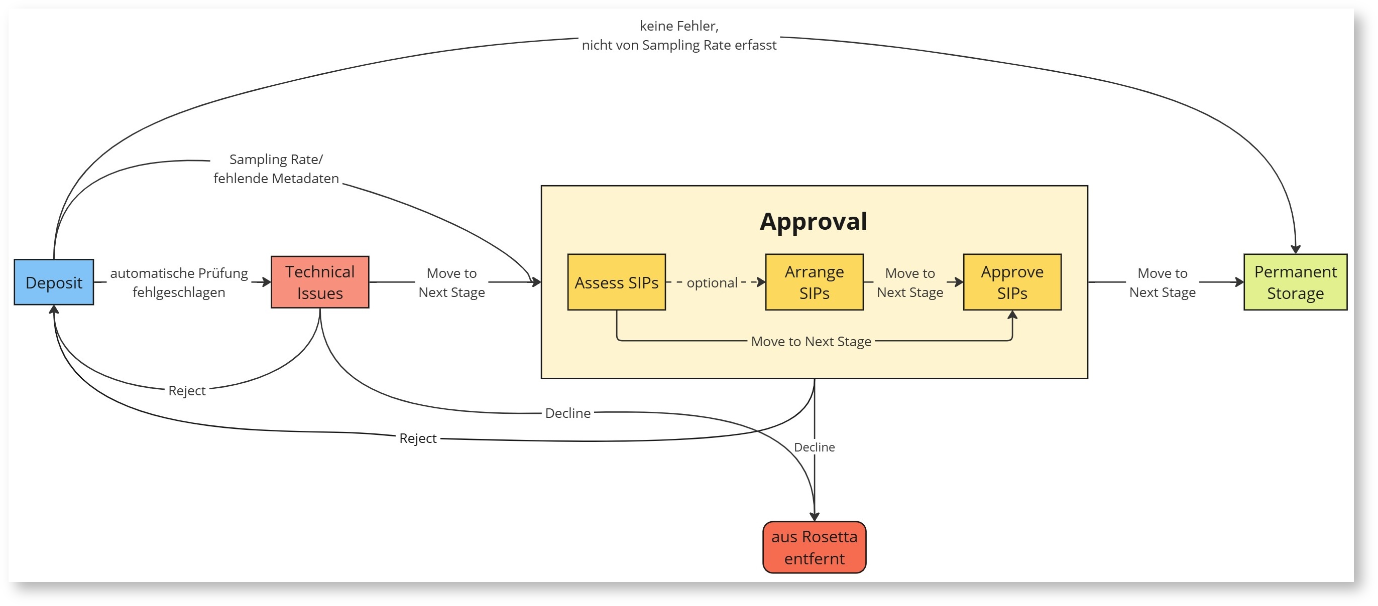 - Approver: finales Absegnen von SIPs und Verschieben in den Permanentspeicher; es findet in der Regel keine Fehlerbehandlung statt