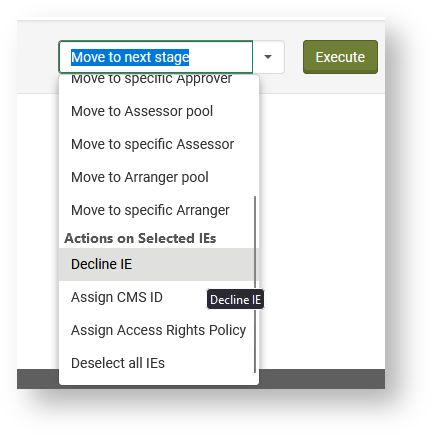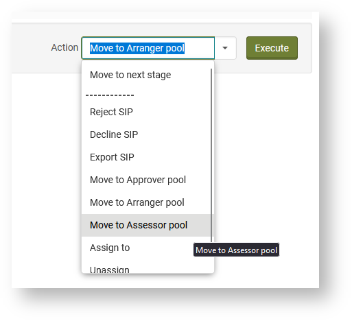 Die Reihenfolge, in der SIPs die drei Approval Stages in Approval durchlaufen, kann pro Institution individuell konfiguriert werden. Ein Verschieben in den nächsten Bereich wird jeweils mit der Action Move to next stage ausgelöst. Außerdem kann das SIP wieder in andere Arbeitsbereiche verschoben werden, z.B. mit Move to Assessor Pool zurück in den Bereich Manual Assessment. Alternativ können einzelne Inhalte eines SIPs auch einem bestimmten User mit der Rolle Assessor, Arranger oder Approver zugewiesen werden. Dies wird über Move to specific Assessor/Arranger/Approver ausgeführt.