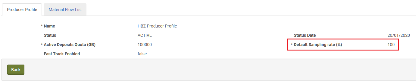 Die Default Sampling Rate der Institution wird unter Deposits → Producers and Agents → Producer Profiles festgelegt. In der Regel steht diese Sampling Rate auf 100% und gilt für die gesamte Institution. Dadurch werden alle eingelieferten Pakete vor dem Permanentspeicher in Approve SIPs verschoben.