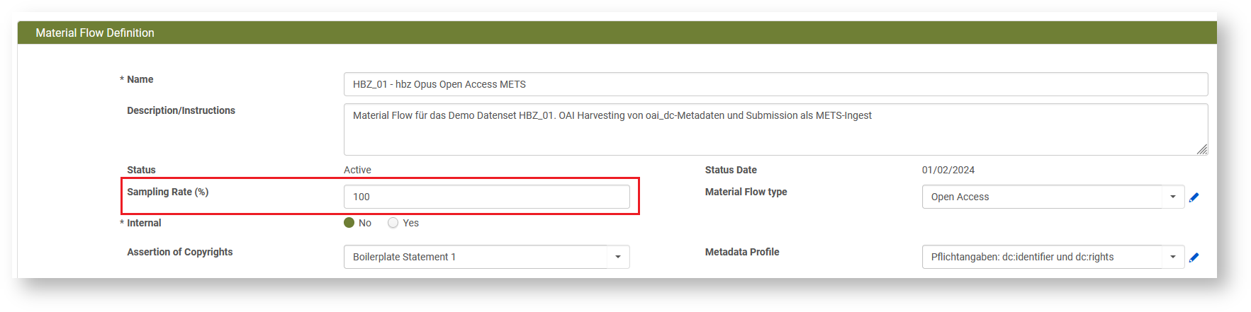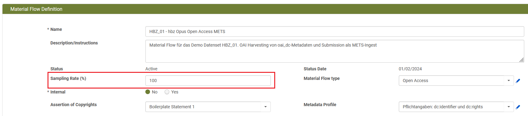 Die Sampling Rate im Material Flow überschreibt die Default Sampling Rate und gilt jeweils nur für einen spezifischen Material Flow. Dadurch können verschiedene Workflows unterschiedliche Sampling Rates haben, ohne die Default Sampling Rate der Institution zu verändern.