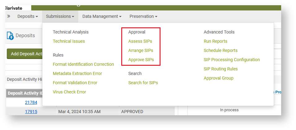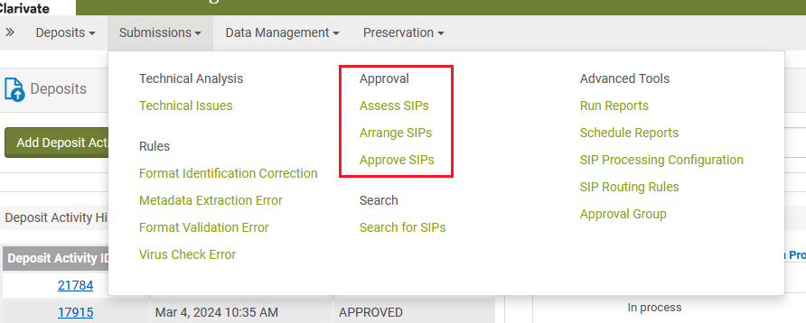 Der Bereich Approval dient der intellektuellen Überprüfung der eingelieferten Inhalte und findet nach den automatischen Prüfungen von Rosetta und der Fehlerbehebung im Technical Analyst statt. Approval ist auf dem Dashboard unter Submissions → Approval zu finden. Es ist der letzte Arbeitsbereich, den ein Submission Information Package (SIP) nach der Einlieferung durchläuft, bevor die Intellectual Entities (IEs) vollständig in Archival Information Packages (AIPs) umgewandelt und in den Permanentspeicher von Rosetta verschoben werden.