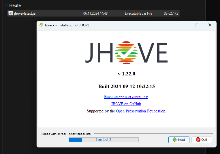 - JHOVE wird als als JAR-Datei von folgender Webseite heruntergeladen: https://jhove.openpreservation.org/