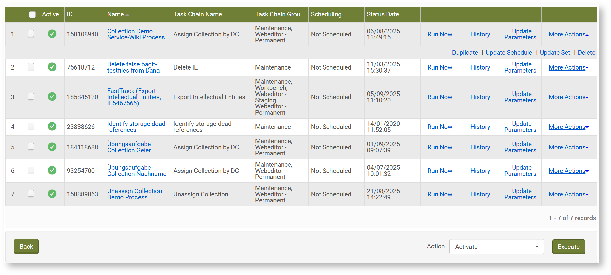 • Action Menü (unten rechts): mehrere angehakte Prozesse, können auf einmal aktiviert, deaktiviert oder gelöscht werden, dazu die gewünscht Option auswählen und auf Execute klicken