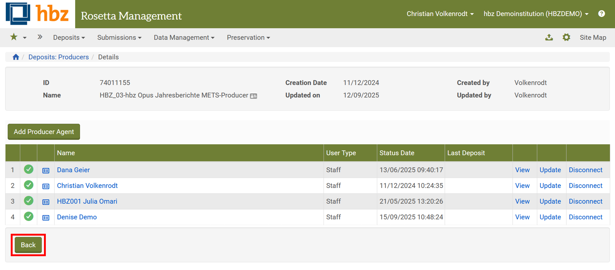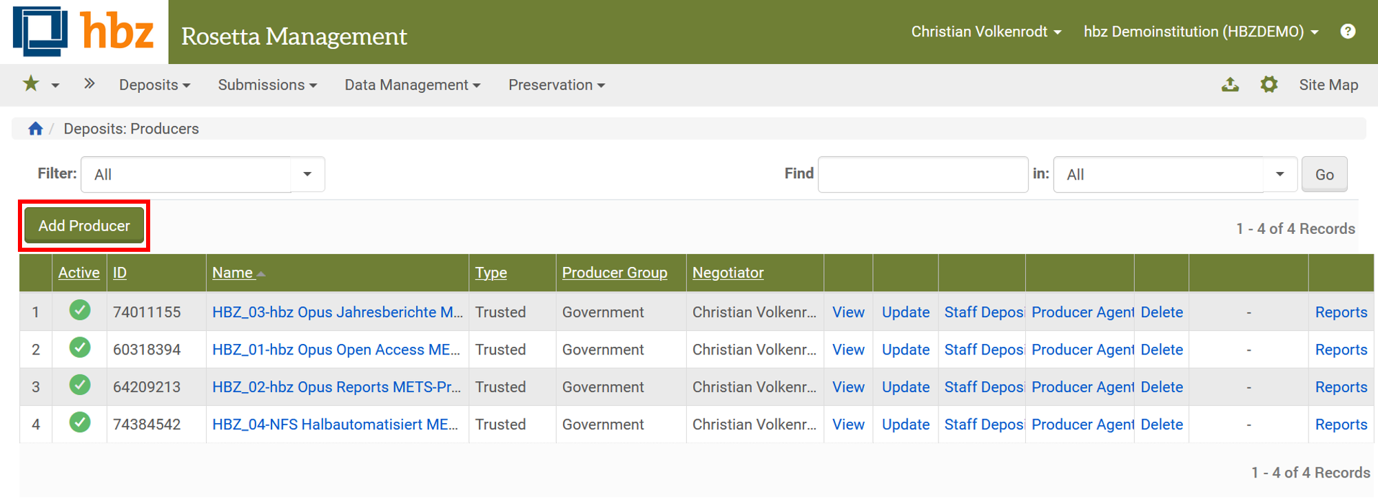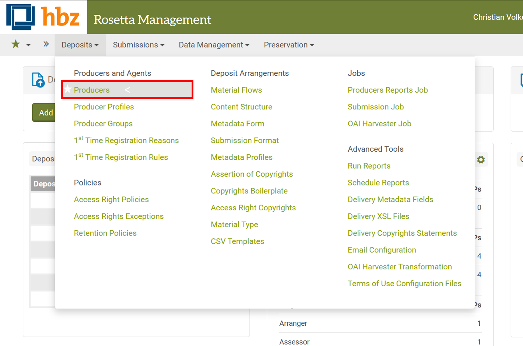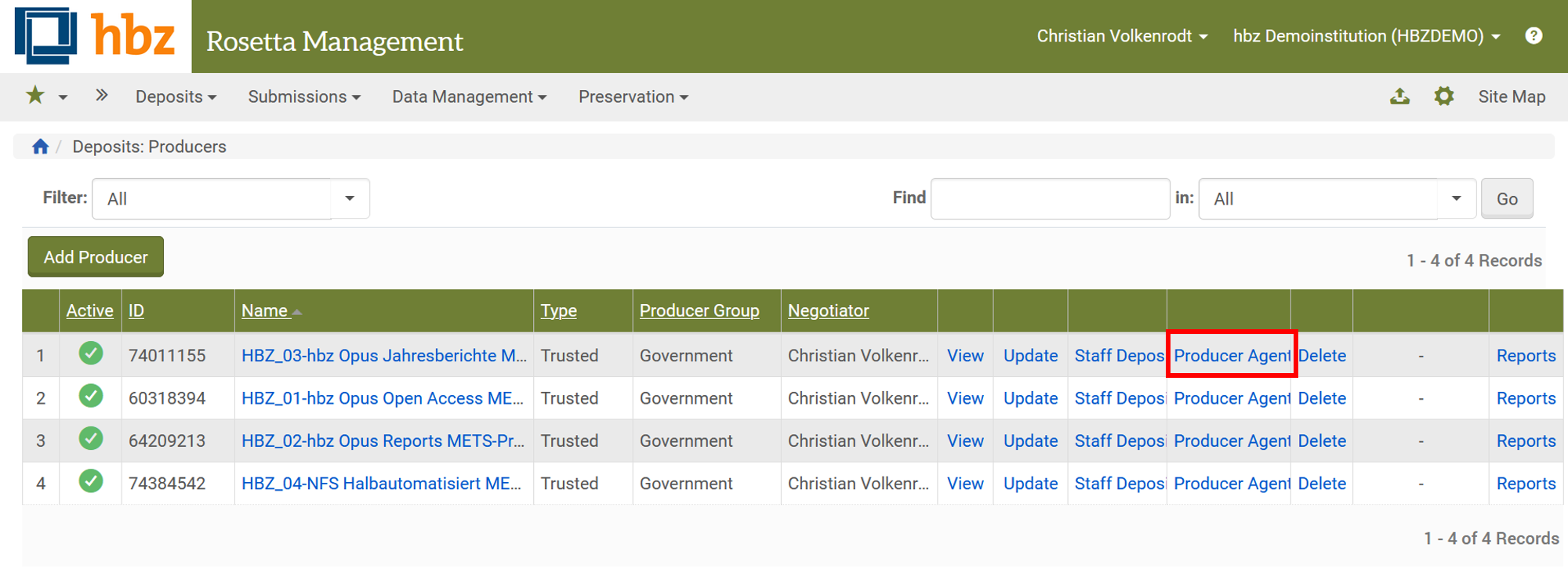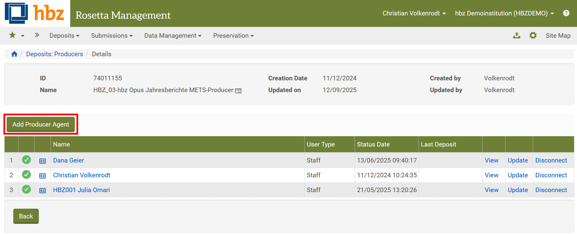 Producer Agents im durch das hbz betriebenen Rosetta-System sind User, die technisch berechtigt sind, Daten für einen Bestand einzuliefern. User können jederzeit einem bestehenden Producer als Producer Agents zugewiesen oder entfernt werden.