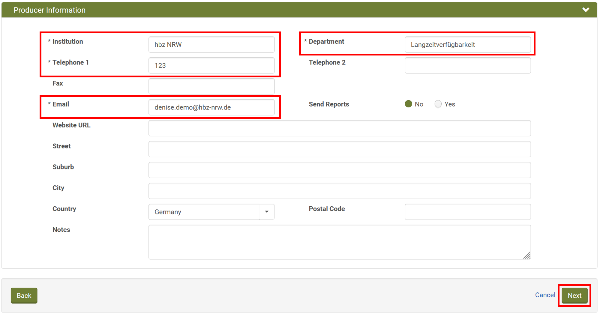 Producer Information mit ausgefüllten Pflichtfeldern und der optionalen Angabe des Landes als Germany