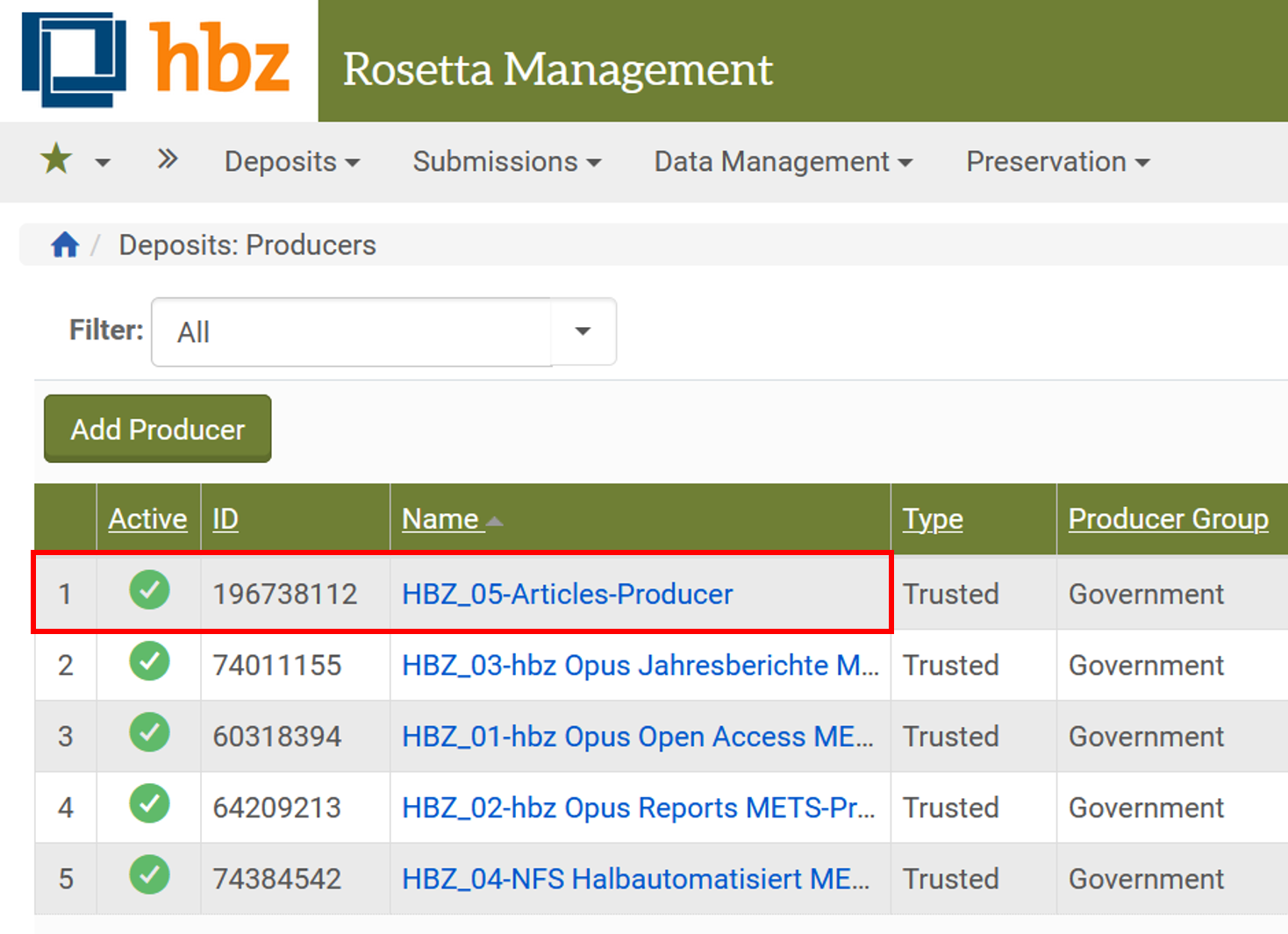 Im Kontext des Rosetta-Systems, das durch das hbz betrieben wird, entspricht ein Producer einem Einlieferungsbestand, z. B. Hochschulschriften oder Retrodigitalisaten. Das Anlegen eines dezidierten Producers für jeden Bestand dient dazu, die Bestände in Rosetta besser voneinander abgrenzen zu können.