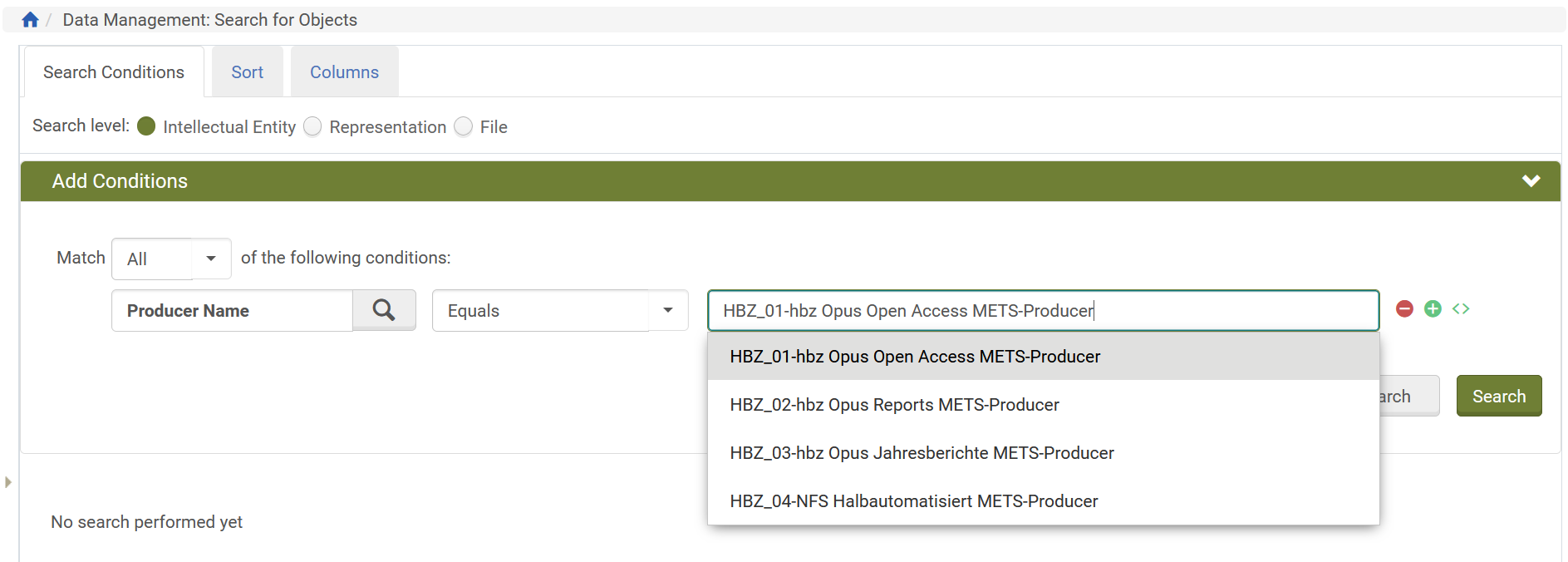 Wichtig ist dies vor allem bei der Erstellung von Exception Rules während der Fehlerbehandlung. Wird in den Regeln der Parameter Producer genutzt, wird dadurch sichergestellt, dass die entsprechende Regel immer nur für den Bestand Anwendung findet, für den sie erstellt worden ist. Außerdem kann bei der Recherche in Rosetta nach dem Producer Name gesucht werden, wodurch die Suchanfrage auf einen bestimmten Bestand eingegrenzt werden kann. Bei der Suche nach Producer Name werden alle vorhandenen Producer automatisch vorgeschlagen. Ebenso ist die Abgrenzung von Beständen wichtig für das Reporting und das Erstellen von detaillierten Statistiken zu den Daten in Rosetta.
