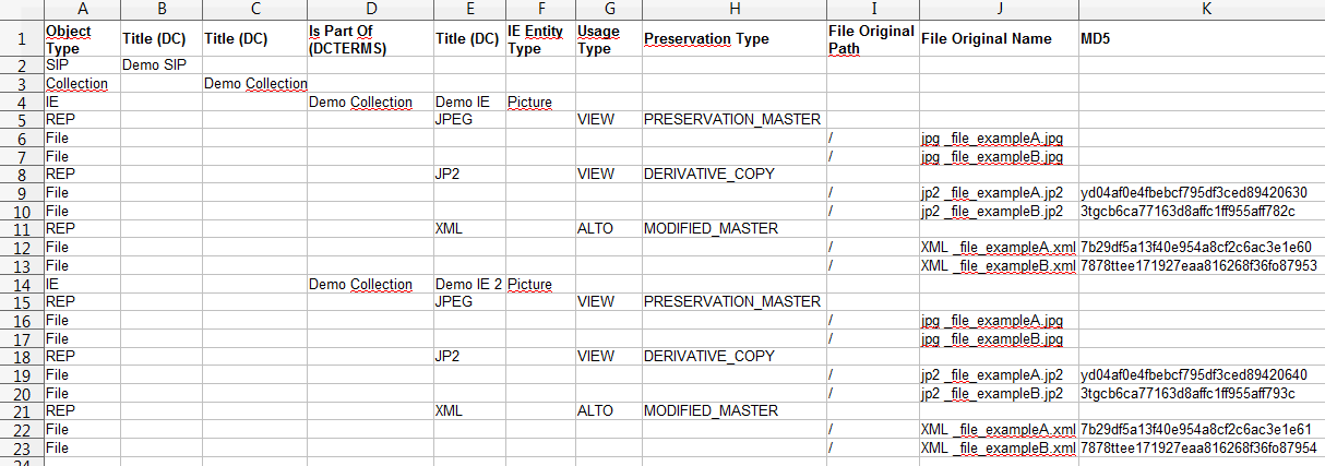 • Die hierarchische Struktur digitaler Ressourcen liest Rosetta Zeile für Zeile aus der Reihenfolge der Records ab. Unterhalb eines IE-Records muss daher immer der Record zur dazugehörigen Representation und darunter müssen wiederum die Records der dazugehörigen Files gelistet werden. Liegen mehrere Representations zu einer IE vor, muss das Feld Preservation Type verwendet werden und eine Zuordnung als PRESERVATION_MASTER , MODIFIED_MASTER, oder DERIVATIVE_COPY erfolgen.