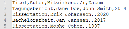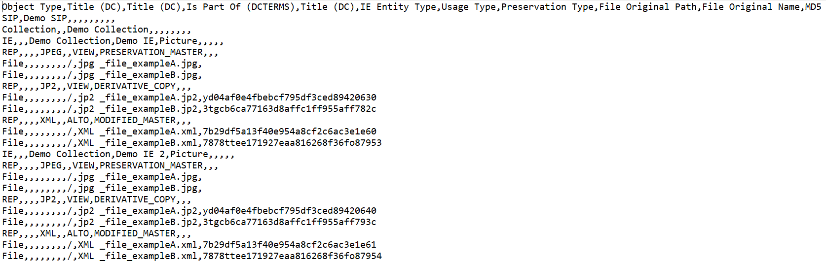 • Beim CSV-Ingest in Rosetta gelten ausschließlich Kommata als Trennzeichen. Vor dem ersten und nach dem letzten Record stehen keine Kommata. Bleibt ein Feldinhalt leer, folgen zwei Kommata direkt aufeinander.