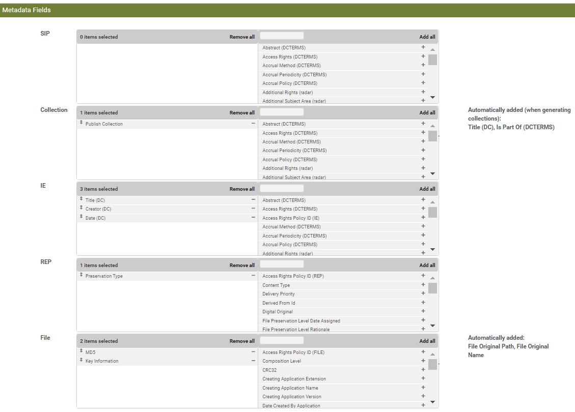 Auf der rechten Seite des Konfigurationsmenüs befindet sich eine Auswahl aller nutzbaren deskriptiven, administrativen und technischen Metadatenfeldern. Aus dieser können die Felder, die dem CSV-Template hinzugefügt werden sollen, nach links verschoben werden. Dies ist für alle Ebenen einer Ressource möglich, also für die SIP-, Collection-, IE-, REP- und File-Ebene.
