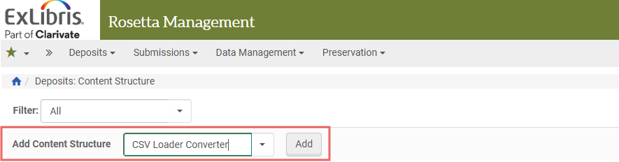 Bei der Erstellung einer neuen Content Structure für einen CSV-Ingest muss der CSV Loader Converter ausgewählt werden. In der Konfiguration wird mittels Drop Down-Menü ein vorher erstelltes CSV-Template ausgewählt.