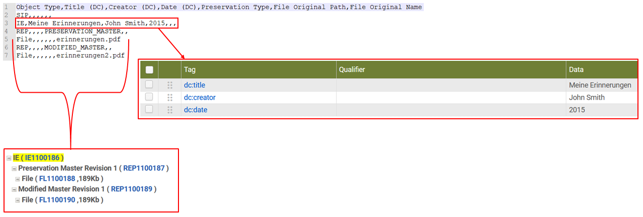 • Abbildung von Records für SIPs, Collections, IEs, Representations und Files in der CSV-Datei