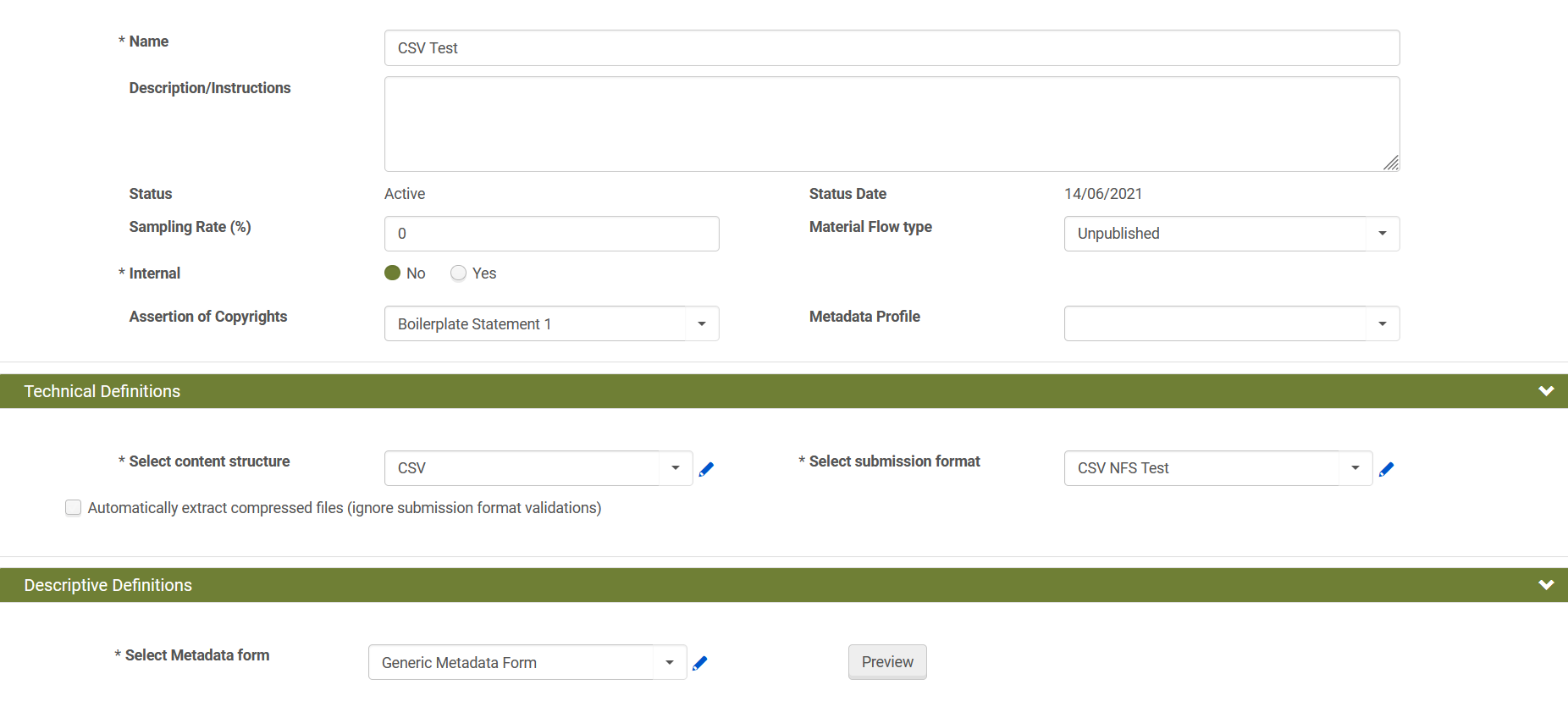 Da für einen CSV-Ingest kein Metadata Form benötigt wird, kann hier unter Select Metadata form das bereits hinterlegte Generic Metadata Form genutzt werden.