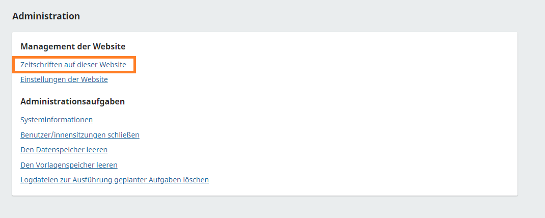 Als Admin legen Sie die ersten Benutzer/innen einer Zeitschrift in OJS an, nachdem Sie zunächst eine Zeitschrift angelegt haben. Hierbei handelt es sich um die Herausgeber/innen einer Zeitschrift. Sie erhalten die Rolle "Zeitschriftenverwalter/in".