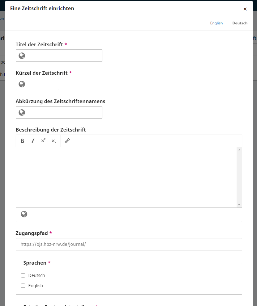• geben Sie hier den Namen der Zeitschrift ein. Der Name fungiert als Unterpfad Ihrer Domain. Die URL der Zeitschrift setzt sich dann wie folgt zusammen: www.hochschule-xy-journals/journal-xy