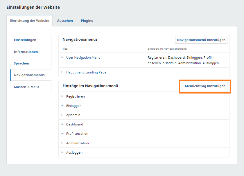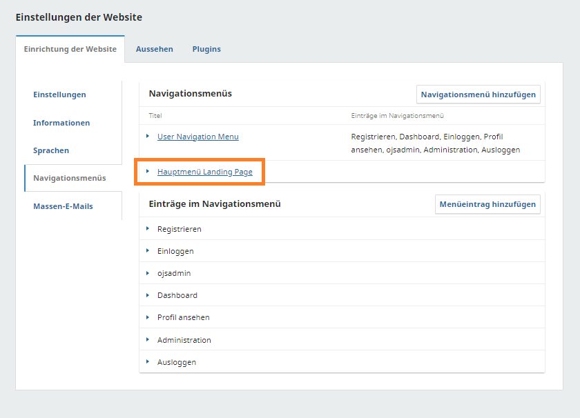 - Klicken Sie Administration / Einstellungen der Webseite / Navigationsmenüs / Navigationsmenü hinzufügen.