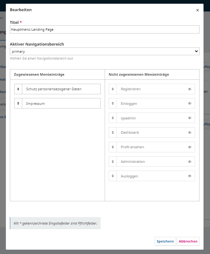 Die Landing Page einer OJS-Instanz verfügt über kein eigenes Hauptmenü. Sollten Sie Impressum und Datenschutzerklärung als eigene Unterseiten der Landing Page sichtbar und zugänglich machen wollen, müssen Sie das Hauptmenü der Landing Page zunächst konfigurieren. Zudem ist bei Registrierung von Benutzer/innen die Zustimmung zur Datenschutzerklärung notwendig. Für diesen Fall verfügt OJS über eine Sektion, in der Sie die Datenschutzerklärung einfügen können (siehe unten). Diese ist nur bei Registrierung sichtbar. Zudem müssen Sie auf Impressum und Datenschutzerklärun im Footer der Landing Page verweisen.