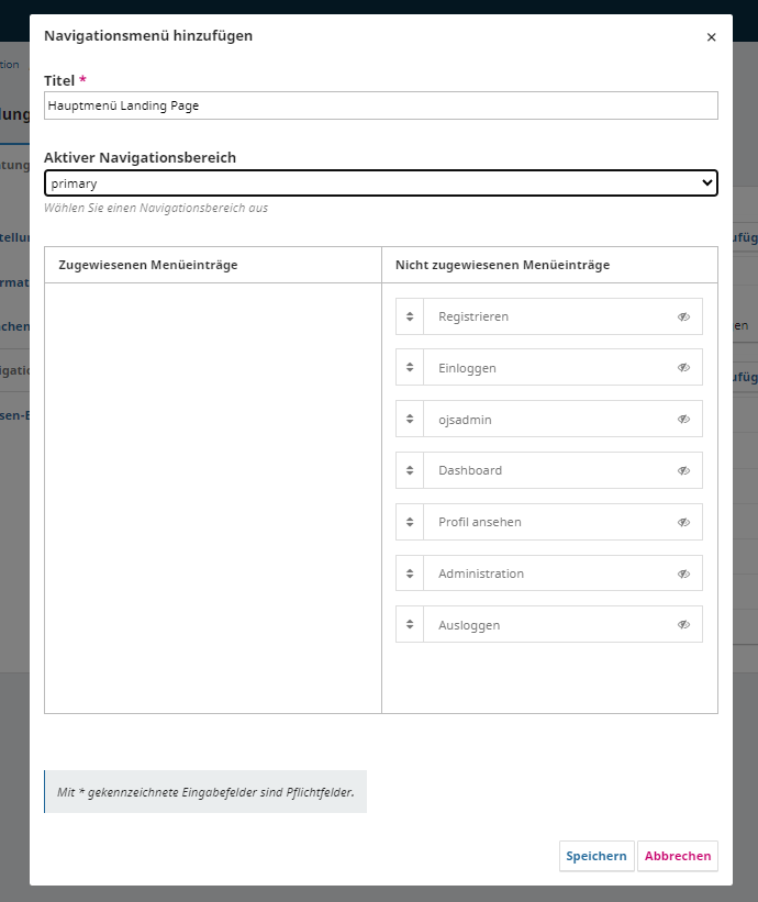 - Ein Pop-Up öffnet sich. Fügen Sie per Drag & Drop die Menüpunkte unter "Zugewiesene Menüpunkte" hinzu.