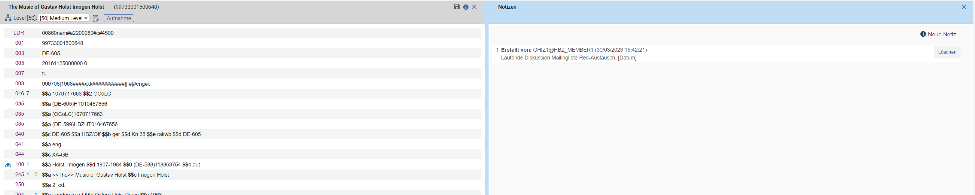 Achtung: Wenn eine laufende Diskussion beendet ist, muss auch die entsprechende Notiz zum Titeldatensatz in Alma gelöscht werden. Das Löschen der Notiz kann von jeder beteiligten Alma-Bibliothek durchgeführt werden. Notizen können nicht recherchiert werden; sie verhindern aber auch nicht das Löschen des Titeldatensatzes, das ohne Hinweismeldung auf Notizen möglich ist.