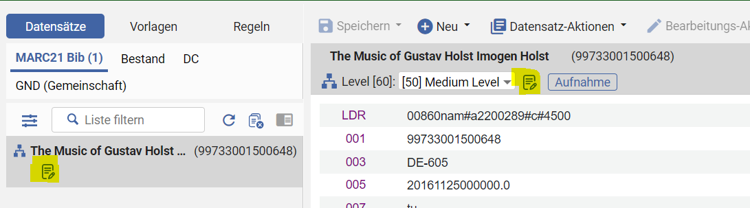 Eine Notiz kann über Verknüpfte Daten anzeigen > Notizen ansehen im Alma-Metadateneditor aufgerufen werden. Das Vorhandensein von Notizen an einem Titeldatensatz wird im Alma-Metadateneditor mit dem Notiz-Symbol in der Datensatzliste und in der Kopfzeile über dem Datensatz markiert: