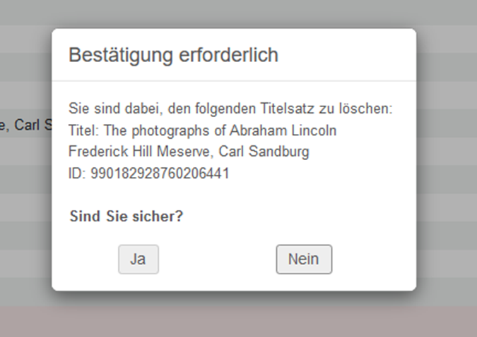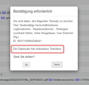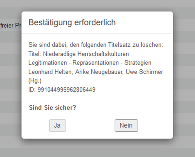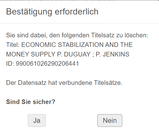 Der Datensatz wird nicht direkt gelöscht: Es folgt ein Fenster "Bestätigung erforderlich", das noch mit "Ja" bestätigt werden muss. Nach der Bestätigung erfolgt die Löschprüfung, erst auf IZ-Ebene, dann auf NZ-Ebene. Sofern keine Gründe vorliegen, die eine Löschung verhindern, wird der Titeldatensatz nach der Bestätigung gelöscht. | |