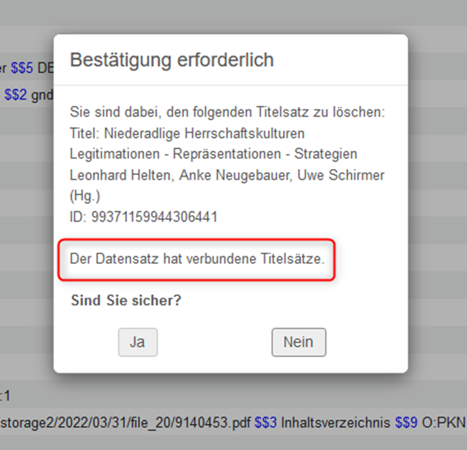 Wenn Verknüpfungen zu anderen Titeldatensätzen (z.B. zu Überordnungen) existieren, gibt es in der Bestätigungsabfrage zusätzlich einen Hinweis darauf: "Der Datensatz hat verbundene Titelsätze". In diesem Beispiel erfolgt der Hinweis aufgrund der Verknüpfung zu einer Überordnung über Feld 830. Titeldatensätze, die mit einem oder mehreren anderen Titeldatensätzen verknüpft sind, können trotz dieser Verknüpfung gelöscht werden. Die Bestätigungsabfrage kann in diesen Fällen mit "Ja" bestätigt werden. Verknüpfungsfelder in anderen Titeldatensätzen: Verknüpfungsfelder in anderen Titeldatensätzen (z.B. bei E-Book-Ausgaben), die auf den zu löschenden Titeldatensatz verlinken, werden nicht gelöscht, auch wenn die Verlinkungen nach der Löschung gebrochen werden. |
