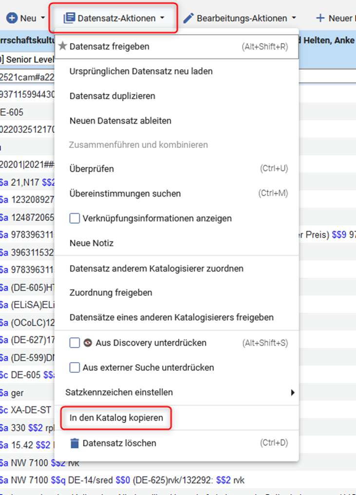 Der Titeldatensatz wird von der NZ entkoppelt. Dazu wird er über „Datensatz-Aktionen“ > „In den Katalog kopieren“ in die IZ kopiert. | |