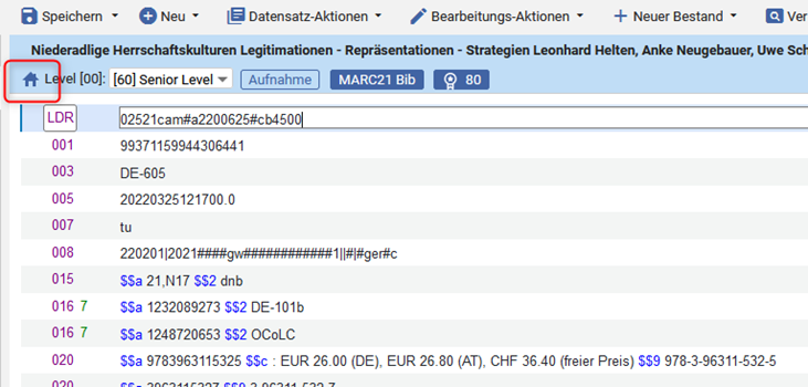 Der Titeldatensatz wurde entlinkt und in das Lokalsystem übernommen. Unten erscheint kurz die Meldung „Datensatz wurde erfolgreich in die Institution kopiert“. Links oben ist nun das Institutionssymbol sichtbar. | |