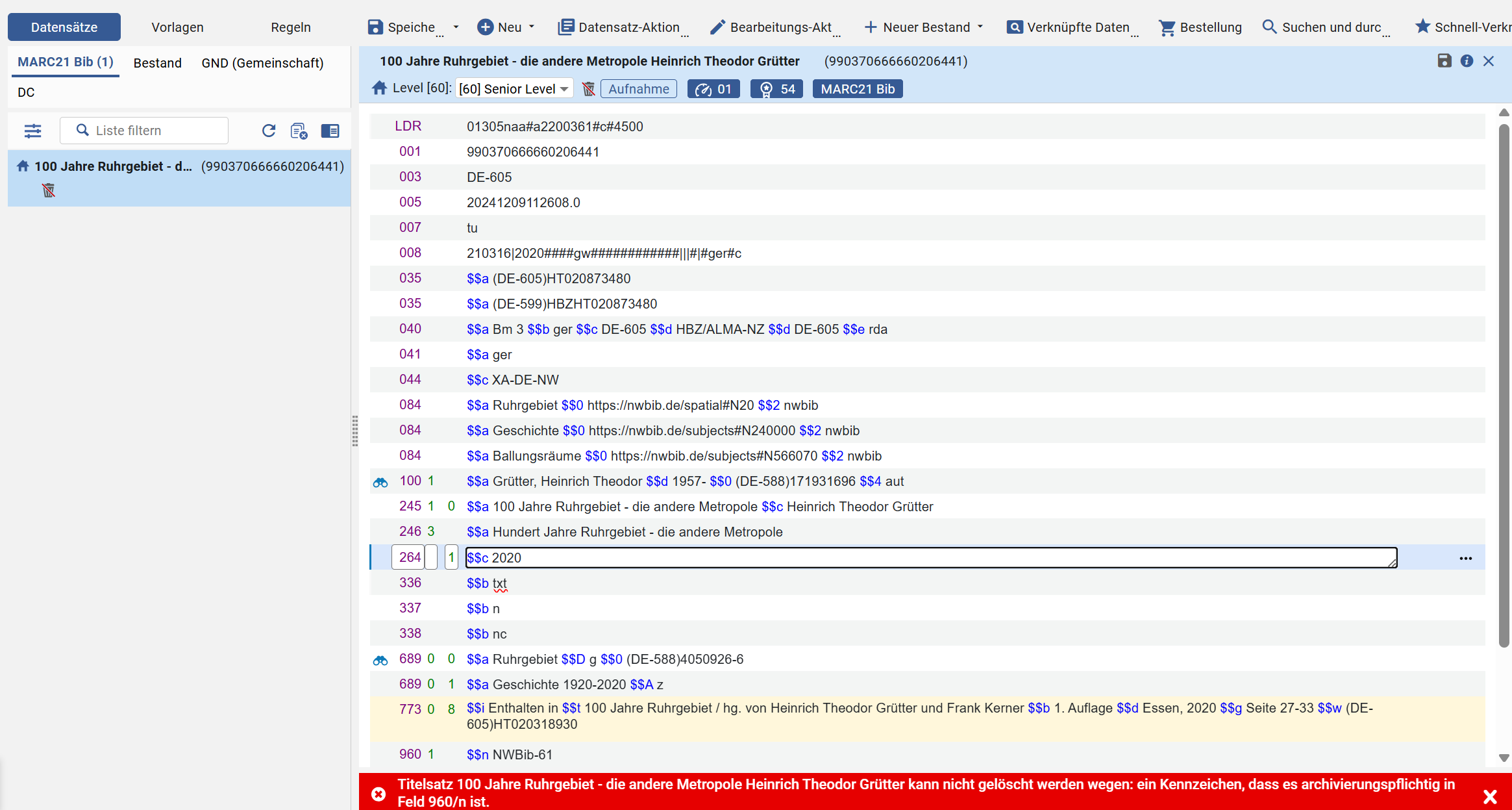 verbundene Titelsätze | Es handelt sich um eine Überordnung, mit der noch Titeldatensätze verknüpft sind, das Löschen ist nicht möglich. |