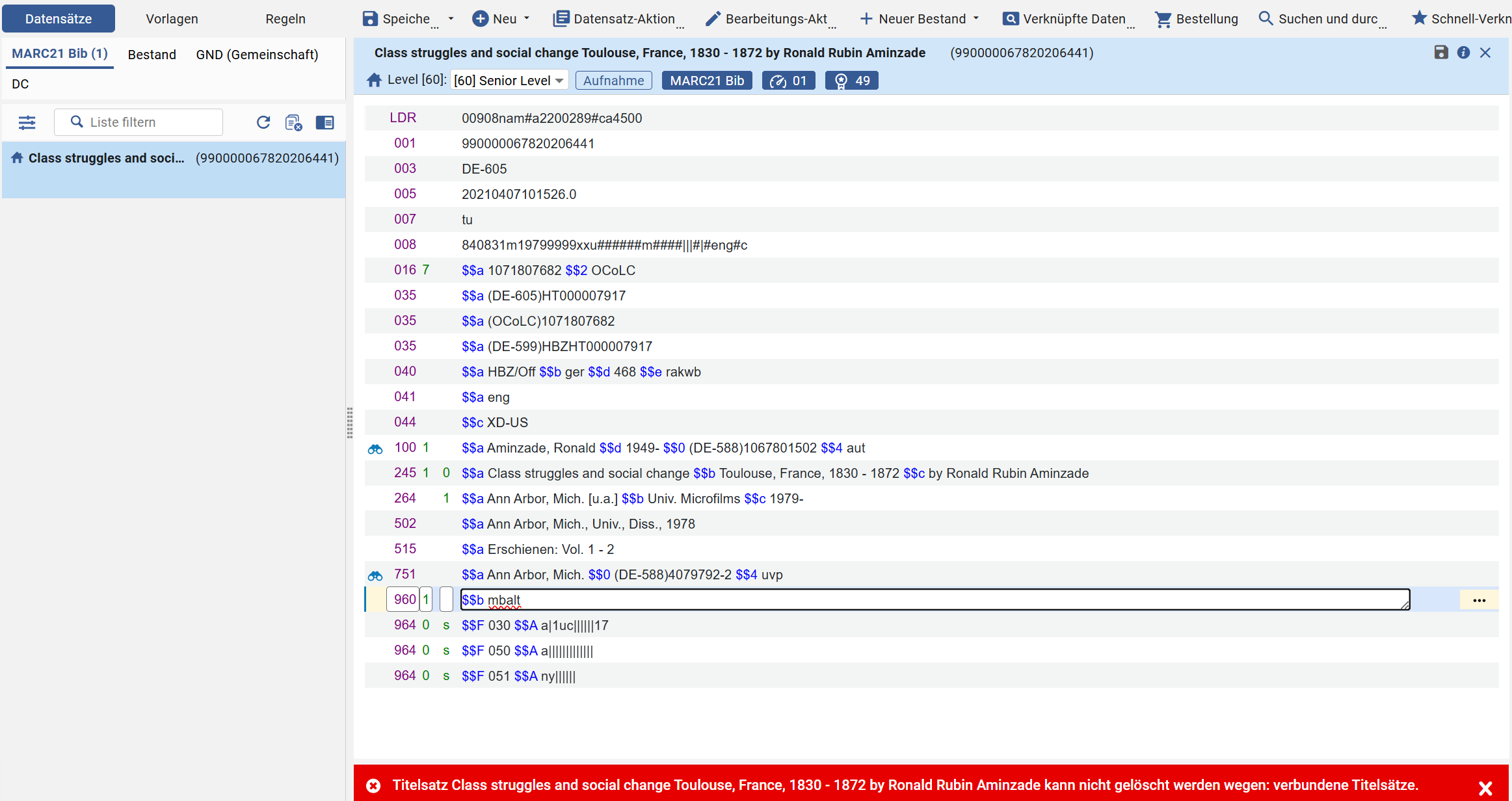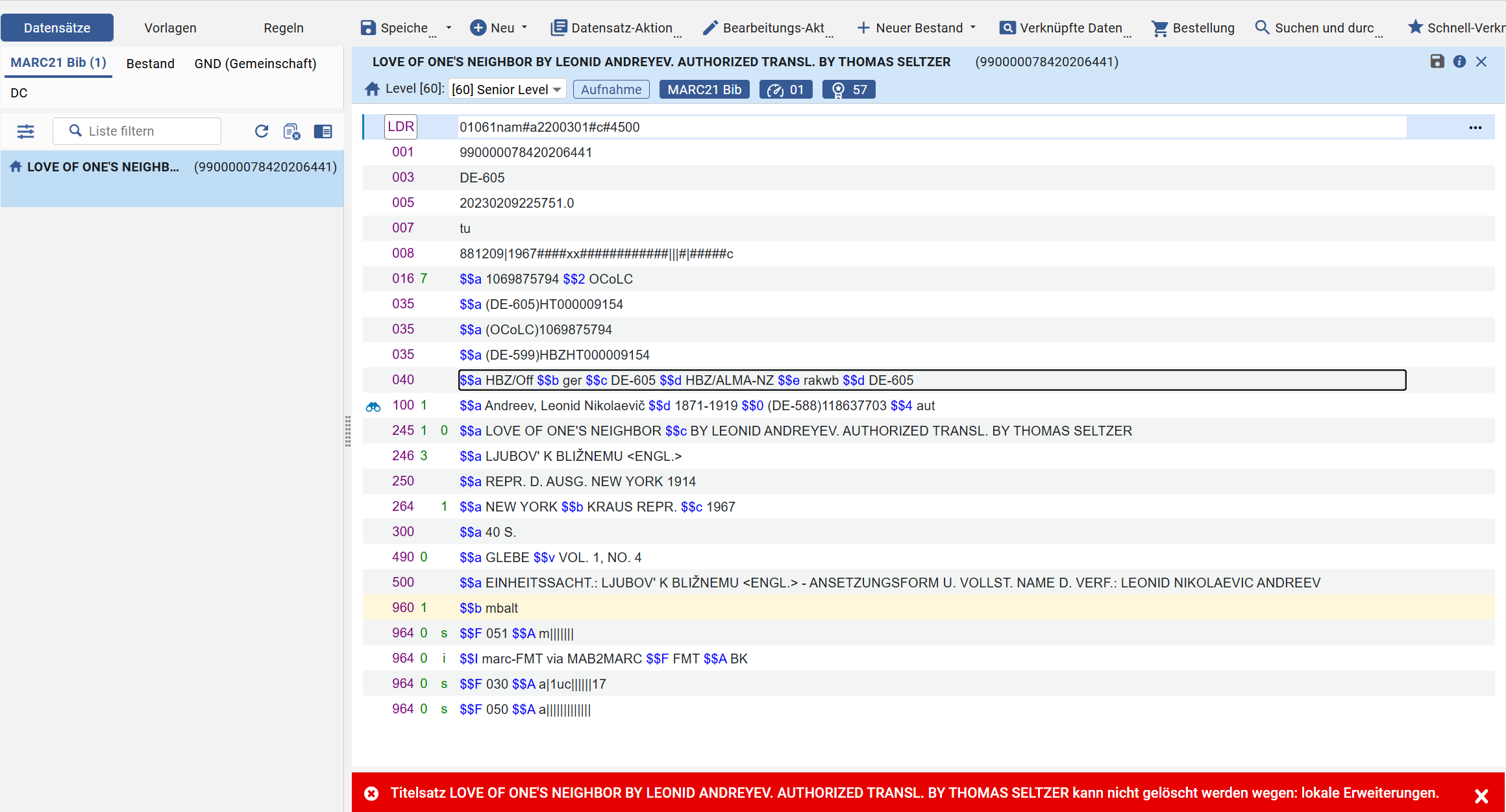 Einige Mitglieder haben eine lokale Version dieses Datensatzes, die nicht gelöscht werden kann | In der eigenen IZ oder der NZ gibt es Bibliotheken, die Bestand am Titeldatensatz haben. Eine Löschung ist nicht möglich. |