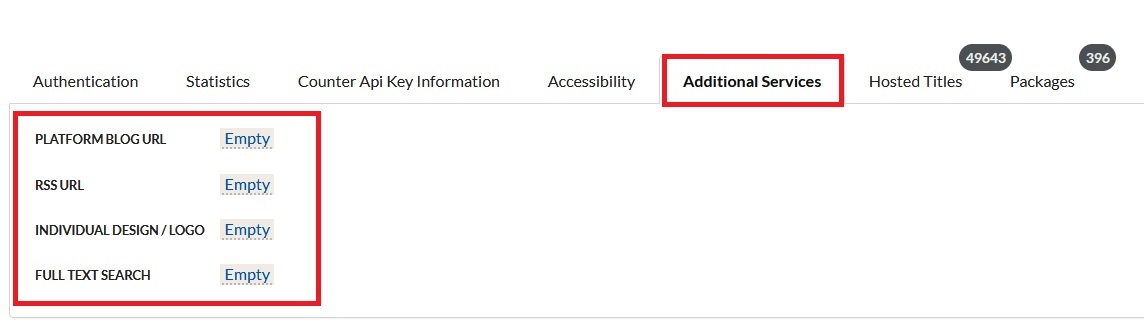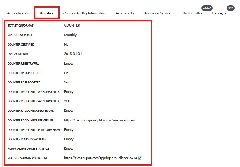 Counter Registry URL: wenn Sie offiziell für COUNTER zertifiziert sind, geben Sie die Registry URL https://www.projectcounter.org/about/register/ an.