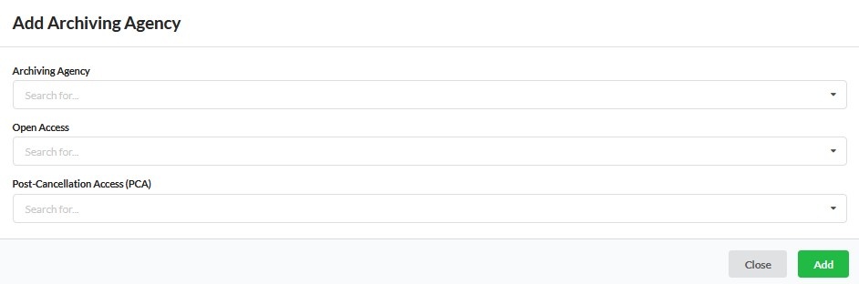 Klicken Sie auf Add Archiving Agency, um unter Archiving Agency auszuwählen, an welche Archivierungsplattform Sie Daten aus