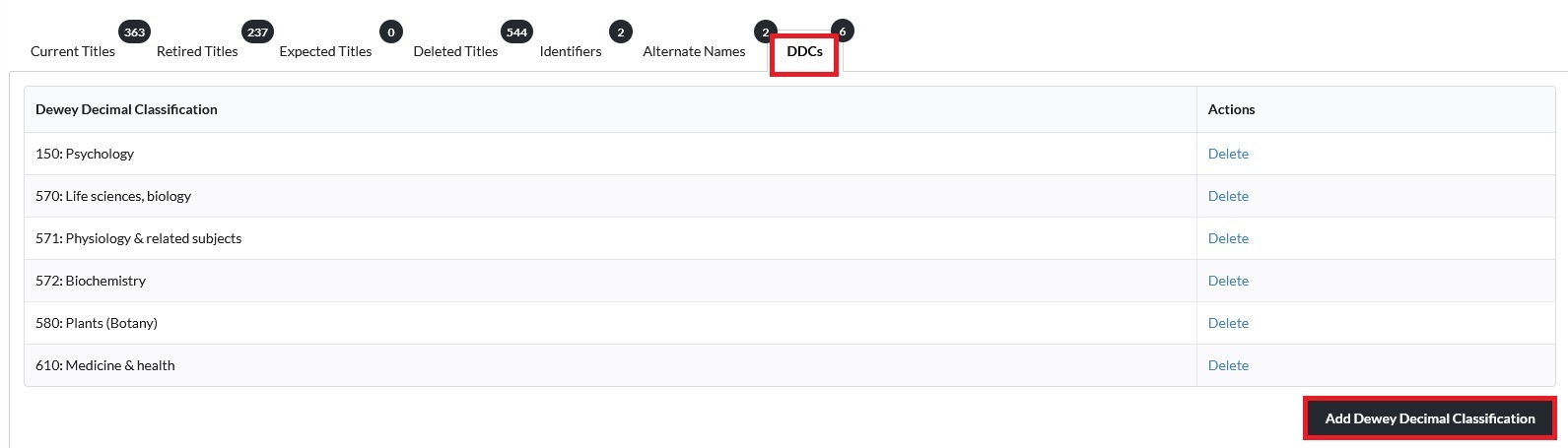 Im Reiter DDCs können Sie für Ihr Paket die relevanten Dewey Decimal Klassen angeben. Klicken Sie auf Add Dewey Decimal Classification,
